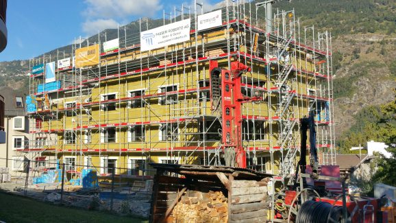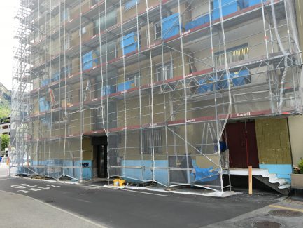 Baustelle Bachji in Brig Aussendämmung Maler- und Gibserarbeiten